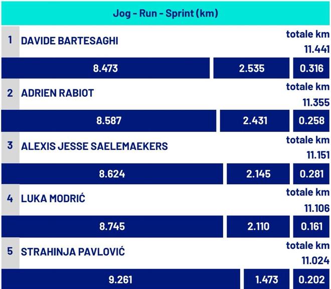 继德比战跑出11.45公里后,本场对阵蓝鹰巴尔泰萨吉再度跑出了11.44公里的队内最长距离,奔跑时的平均速度达到19.7 km/h,仅次于莱奥排名第2。